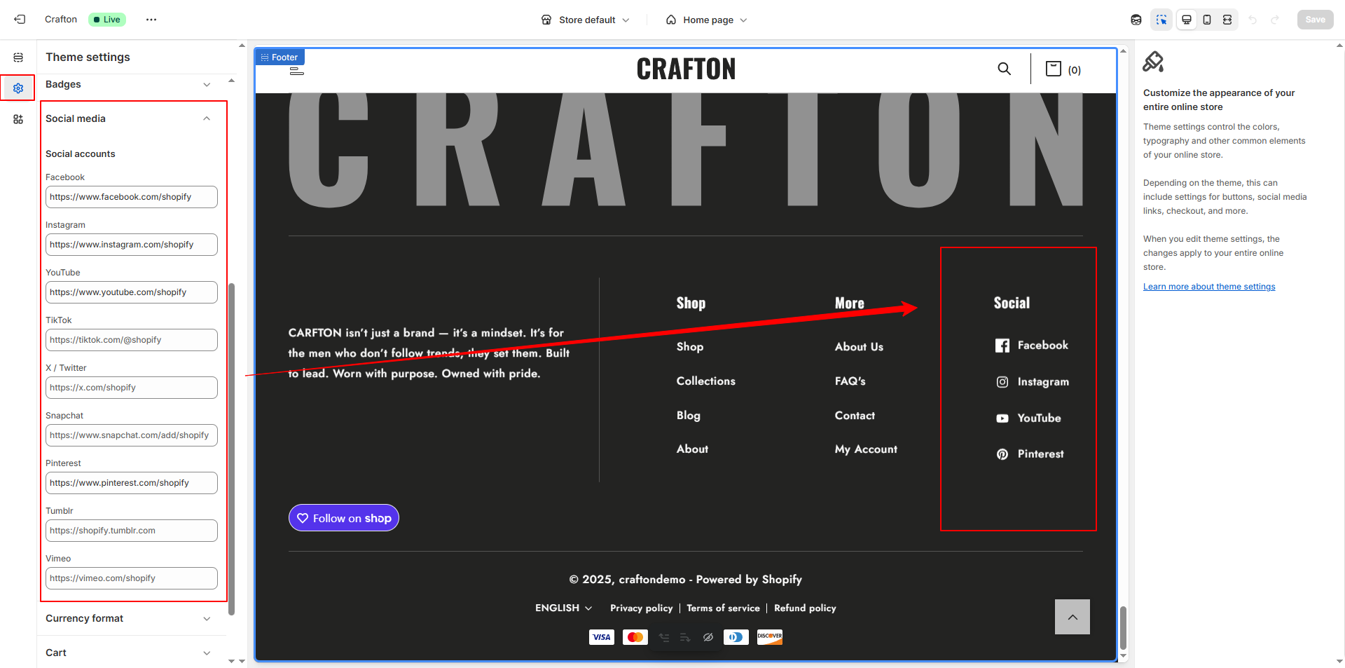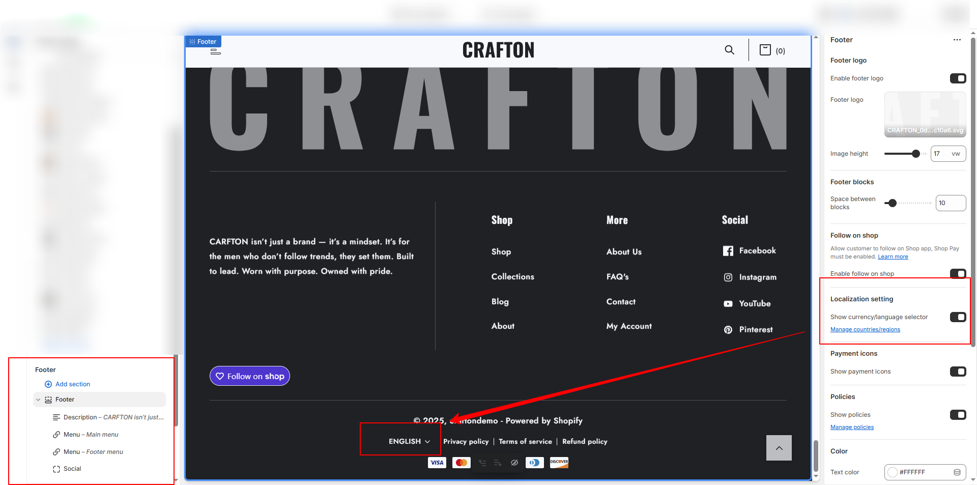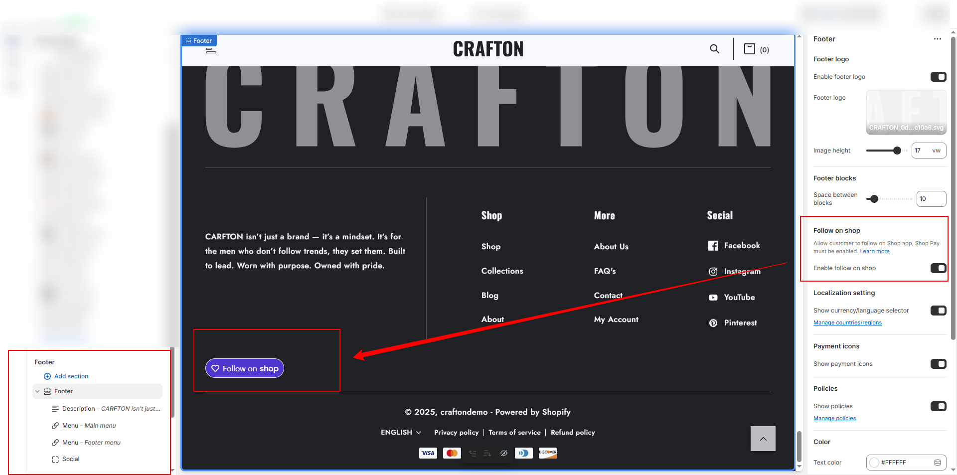 - Crafton’s footer uses blocks, so you can add, reorder, and remove content easily in Shopify’s theme editor.