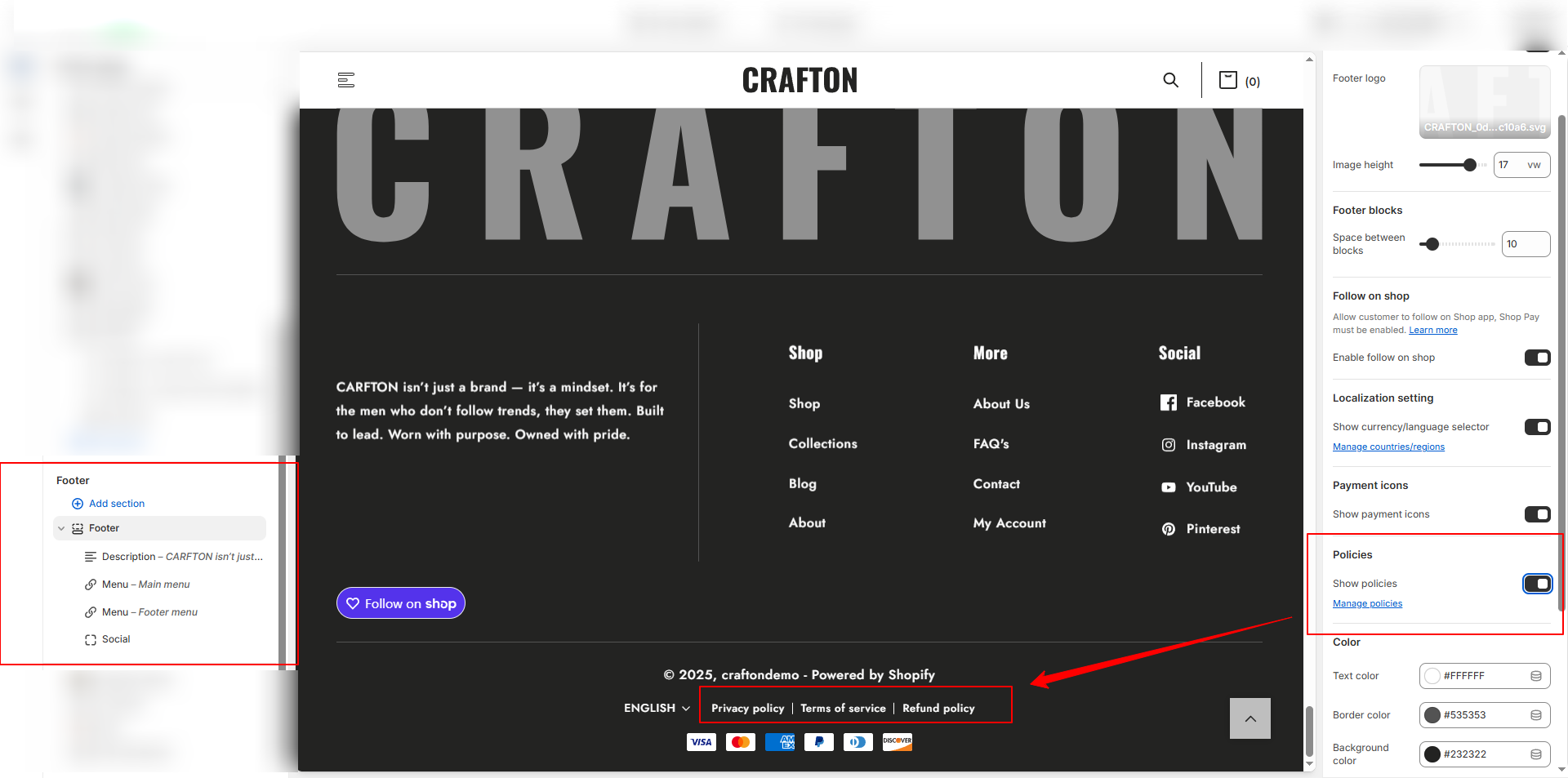 - Once added, enable the Show Policy Links option in the Footer section of your theme settings to display these links in the footer.