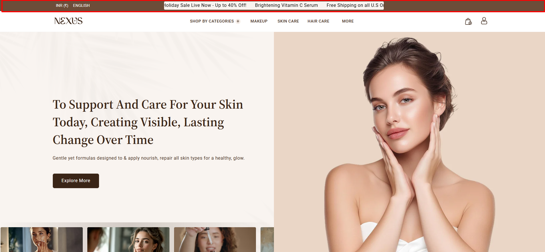 Your Header is the first thing customers notice, helping create a strong and memorable brand impression. Nexus offers multiple header layouts, along with thoughtfully designed icons for the cart, account, and search, ensuring a seamless and stylish shopping experience for your beauty store.