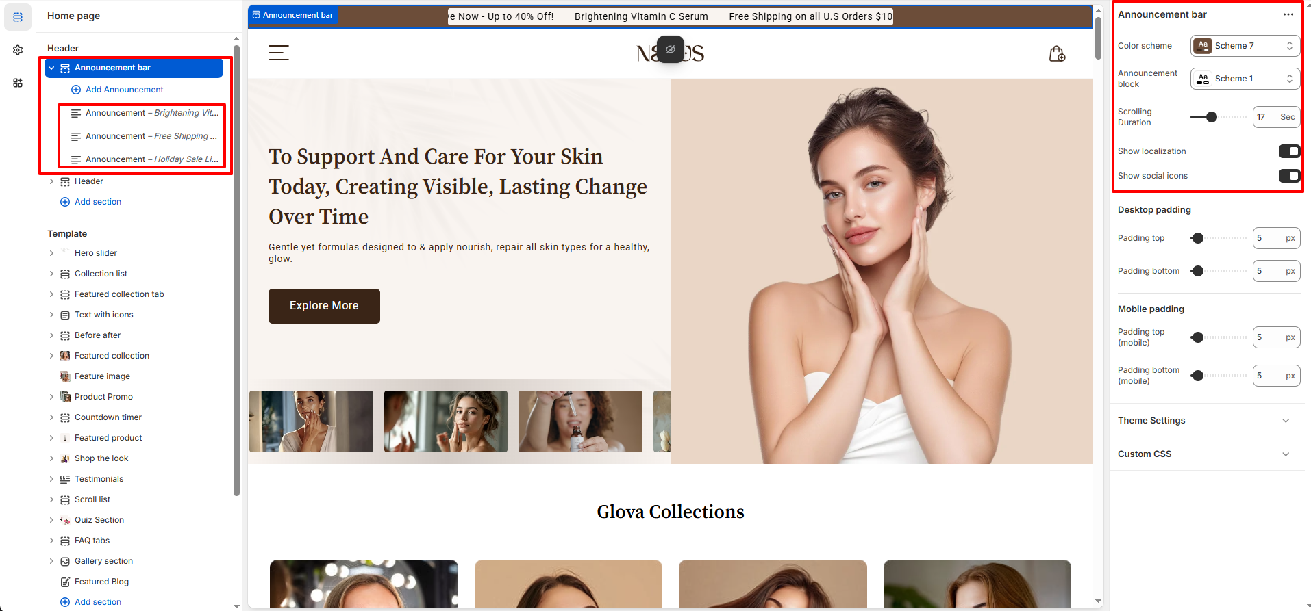 The Announcement Bar in the Nexus theme is a sleek and effective way to share important updates with your customers. Located at the very top of your store, it’s ideal for highlighting promotions, shipping info, or special announcements. You can easily enable,customize, or reposition it using the theme editor—keeping your customers informed without interrupting their shopping experience.