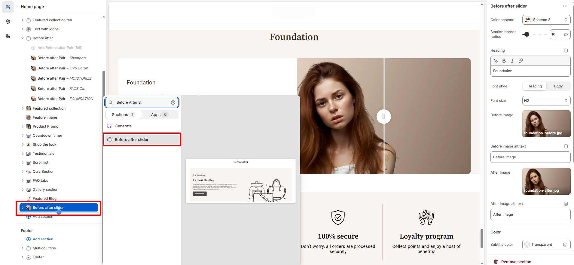 - Click Add section and select Before After Slider from the section list.