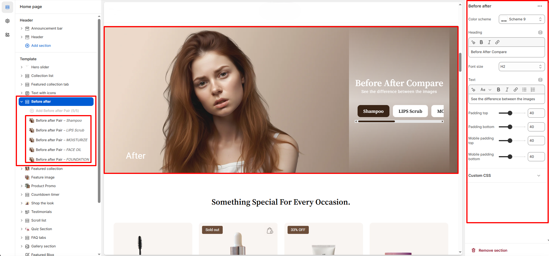 - Click Add section and select Before after from the section list.
