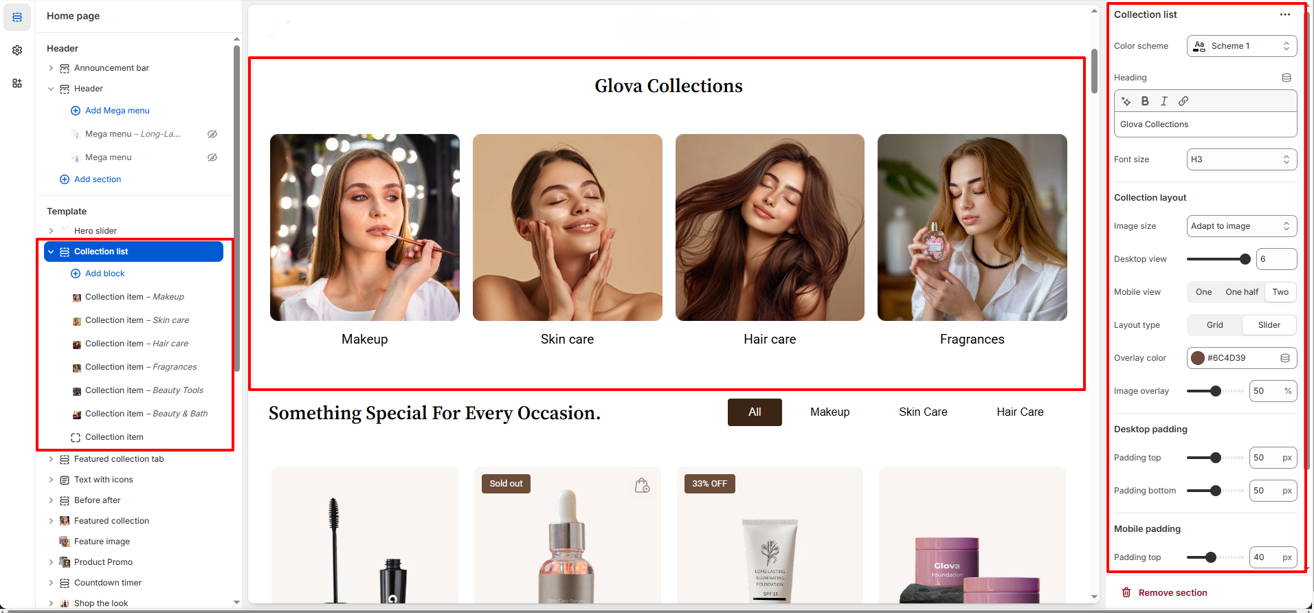 This section is perfect for directing customers to various beauty product categories straight from your homepage—or any page where you add it.
