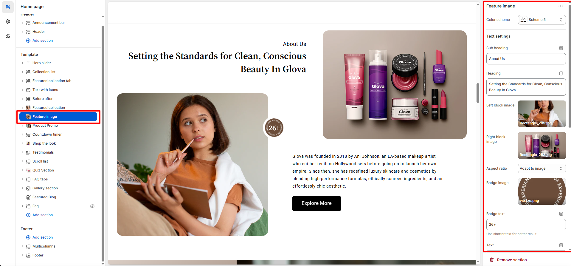 - Badge Overlay for Highlight s Use the Badge Image and Badge Text settings to add eye-catching labels—ideal for expressing values, certifications, or quick highlights like “26+”, “New”, or “Clean Beauty.”
