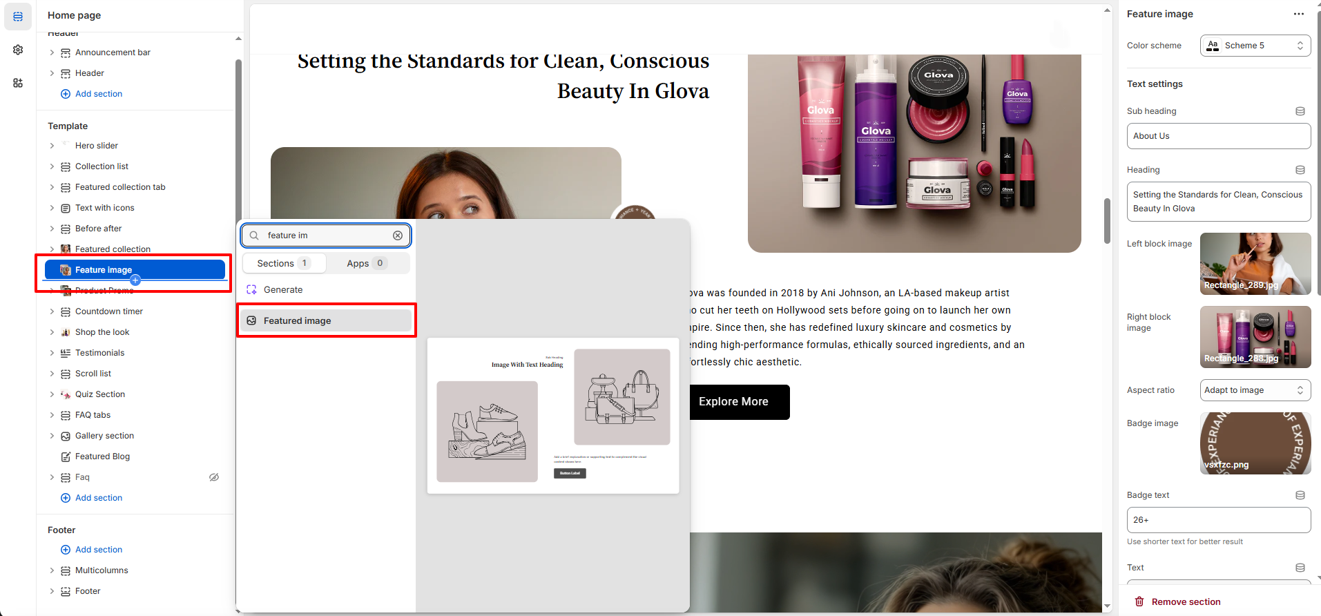- Scroll to the Feature Image section or add it by clicking Add section → Feature Image.