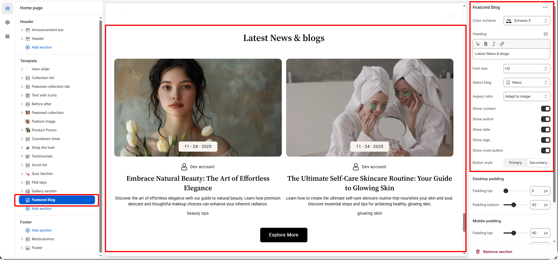 This section is ideal for sharing beauty tips, skincare routines, brand stories, news, and updates, helping you engage customers while improving your store’s SEO.