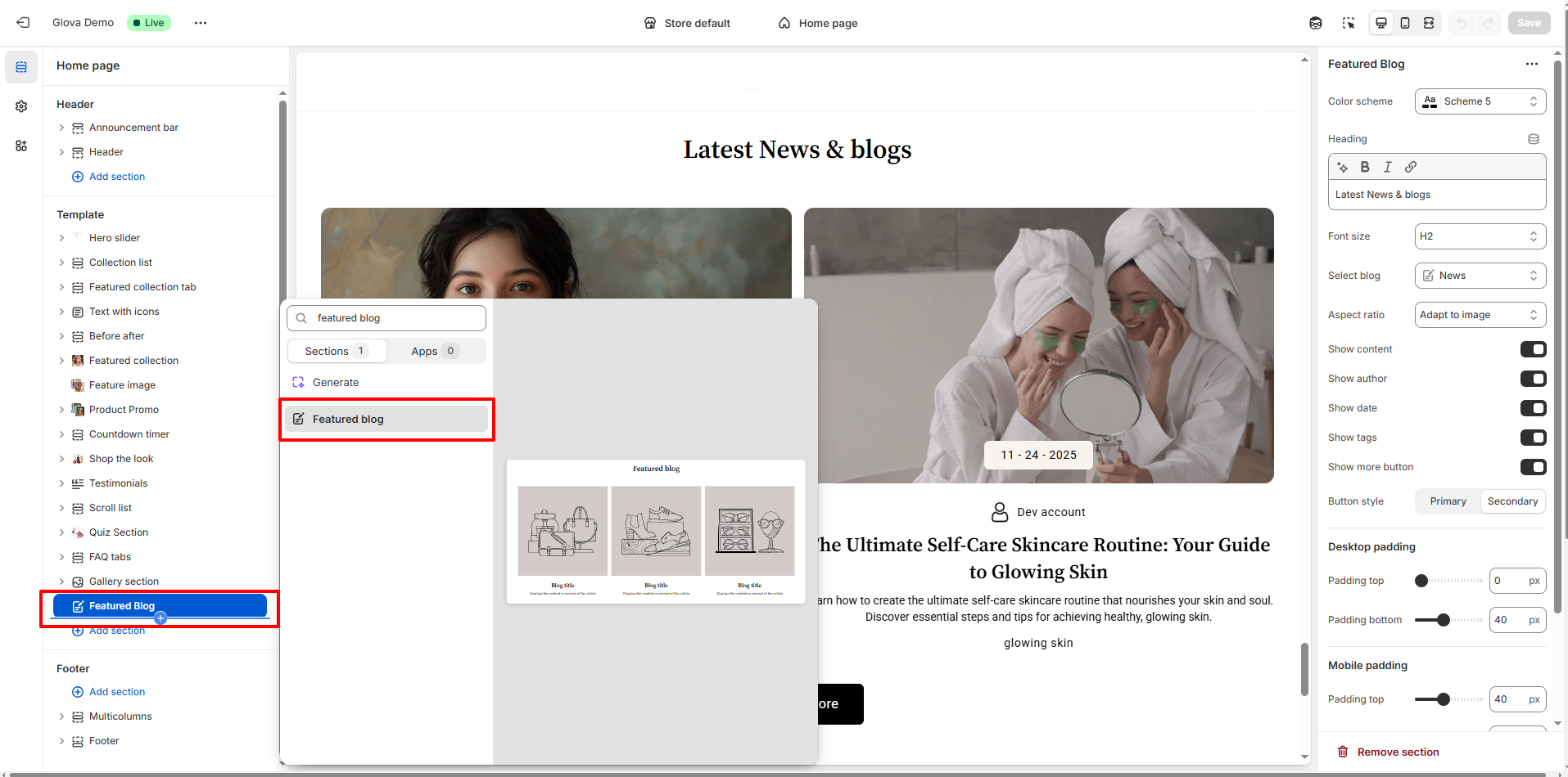 - Highlight Selected Blog Content:Display posts from any Shopify blog to showcase beauty tips, skincare routines, or brand stories.