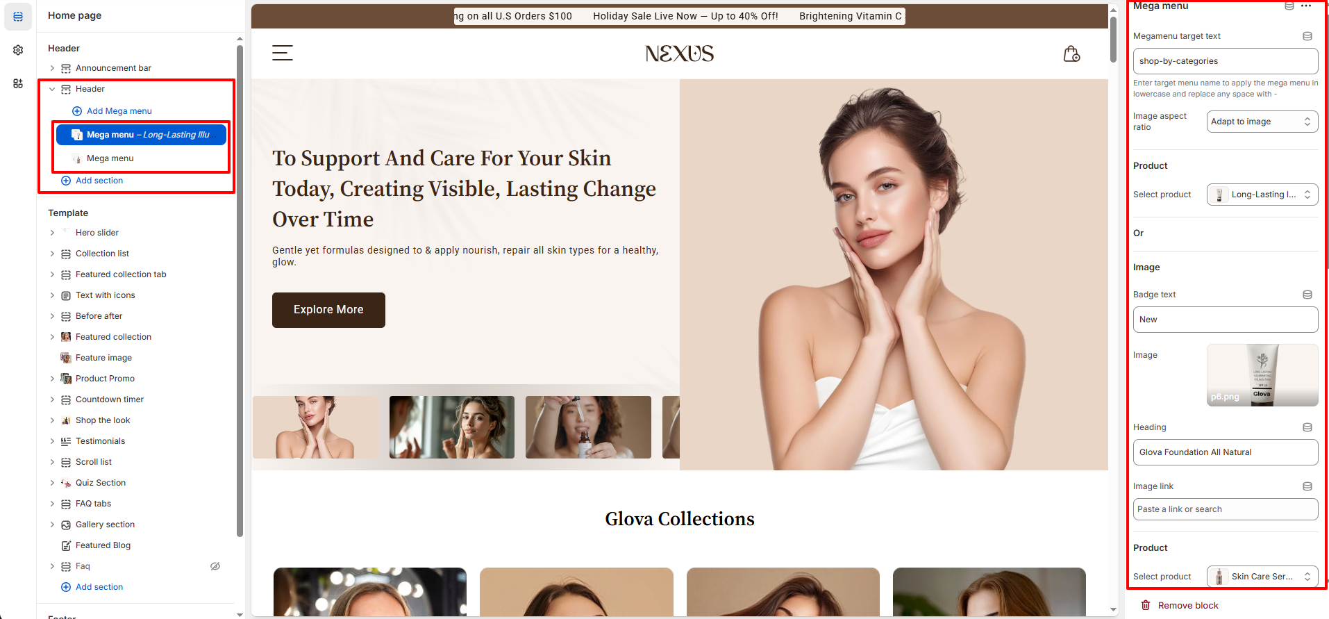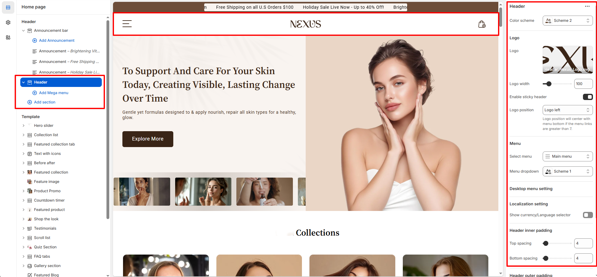 The Header is the very first element shoppers notice when they enter your store. With the theme, you have complete flexibility to customize the header’s layout, menu structure, and logo positioning, ensuring it aligns perfectly with your beauty brand’s look and feel.
