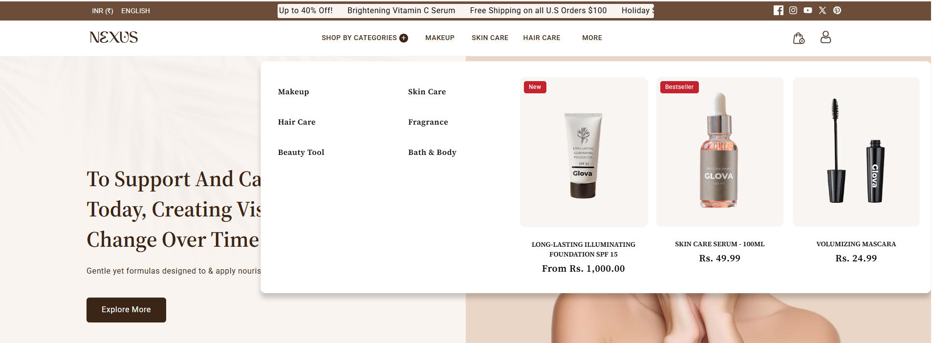 - The theme provides two clean, pre-built mega menu styles designed to showcase products directly in your navigation. This helps shoppers quickly discover key beauty items.