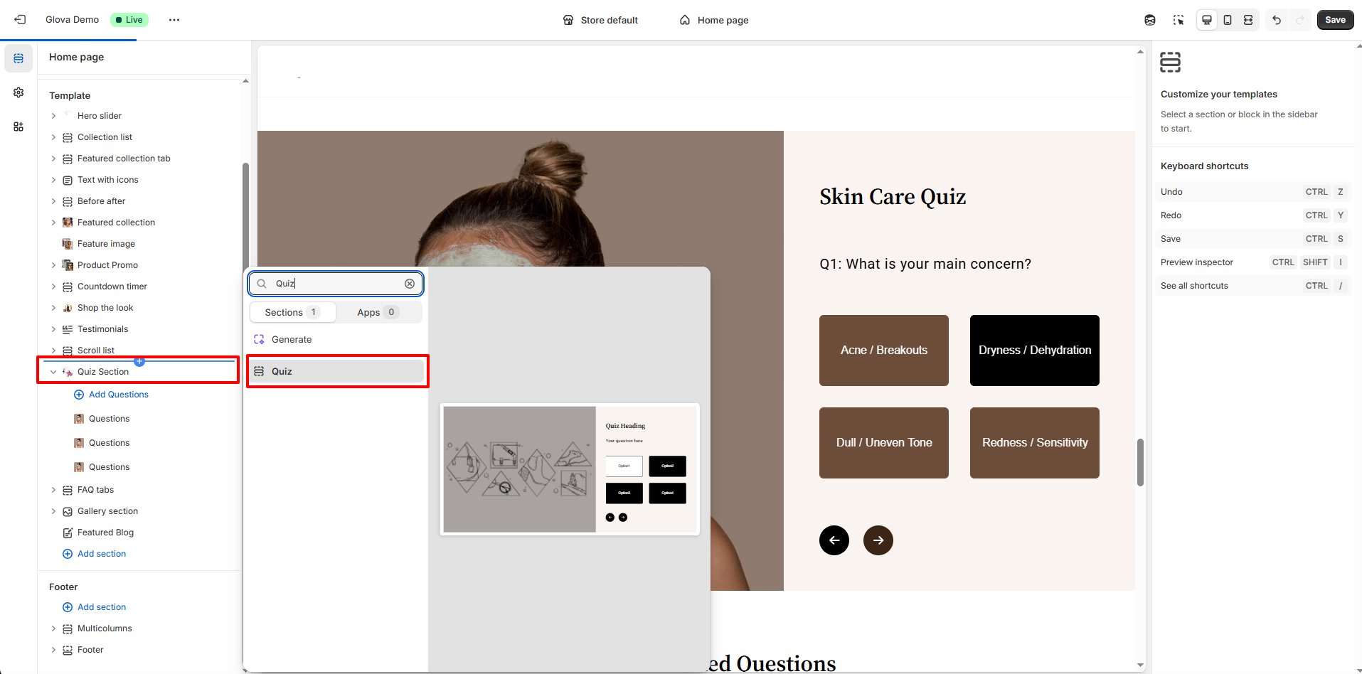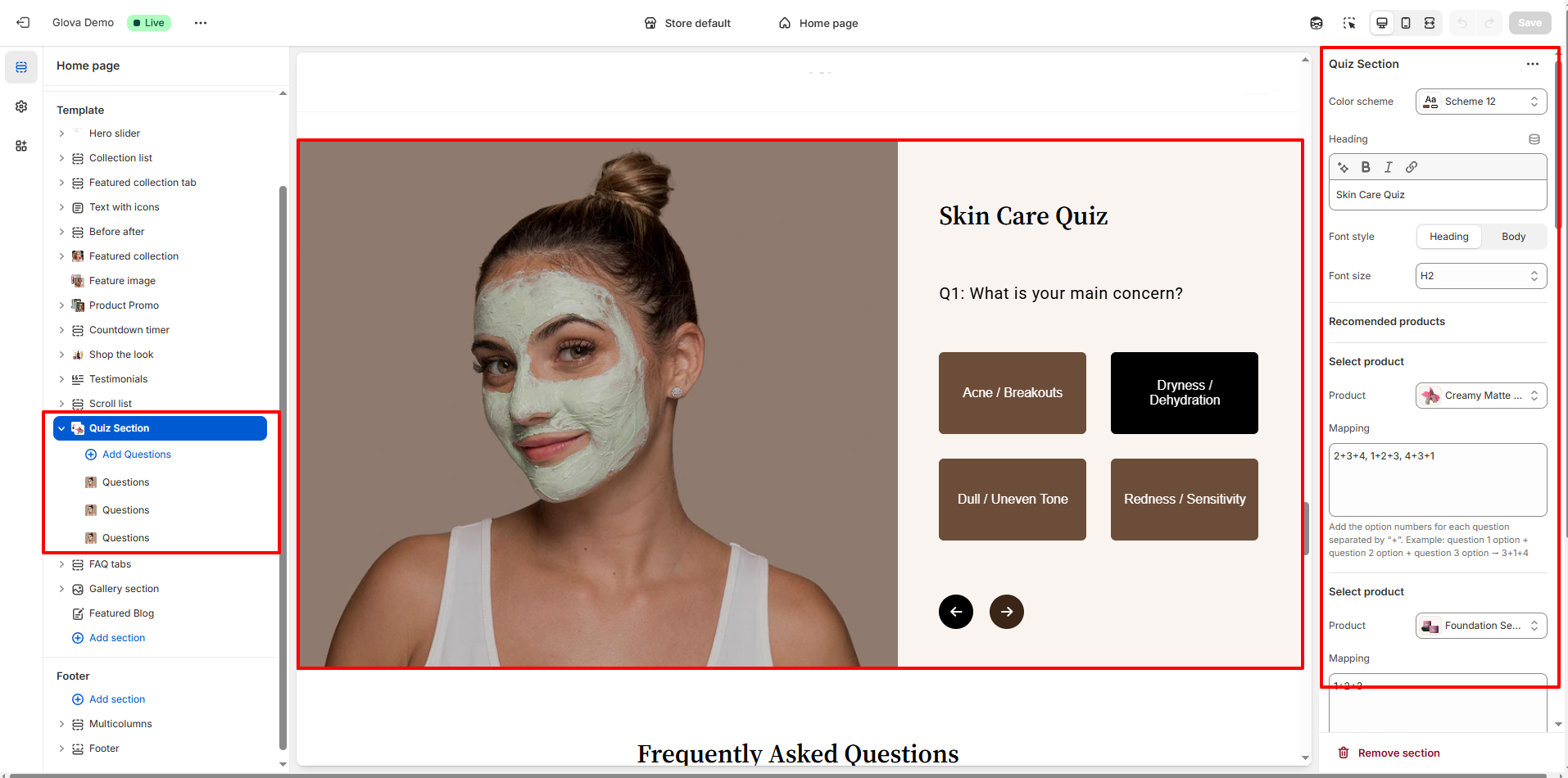 The Quiz Section allows you to create an interactive beauty or skincare quiz that helps customers find the most suitable products based on their answers.