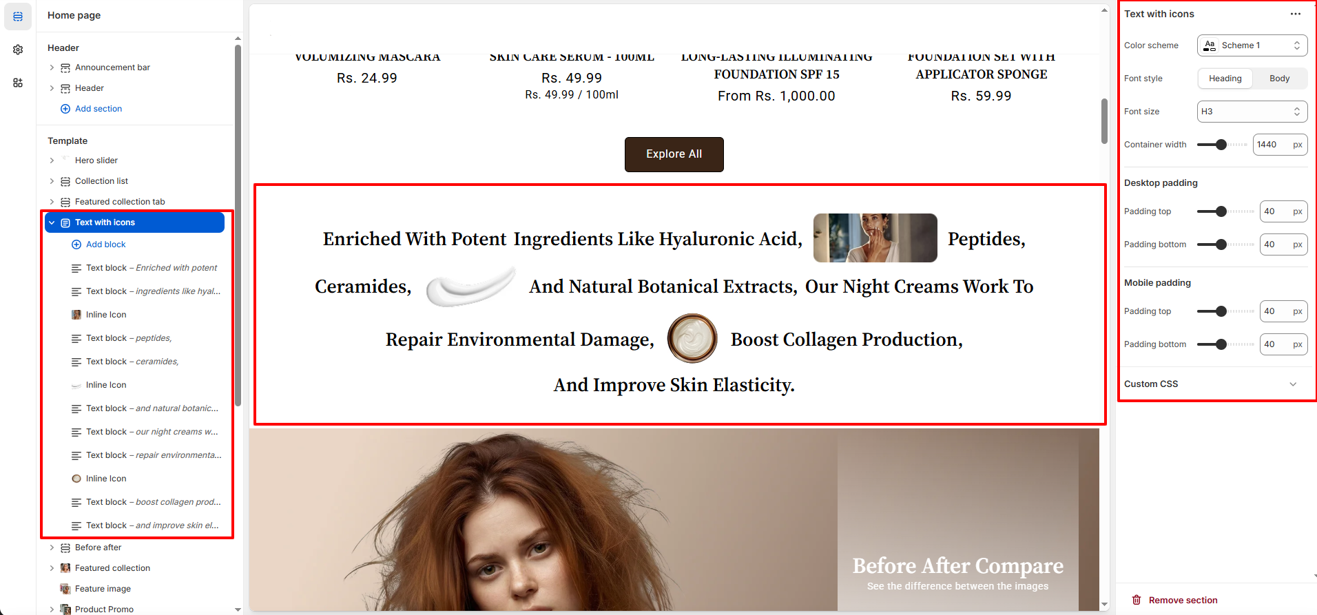 - Separate Text and Icon Blocks: The section includes individual text blocks and icon blocks, allowing you to add, remove, or rearrange each one independently.