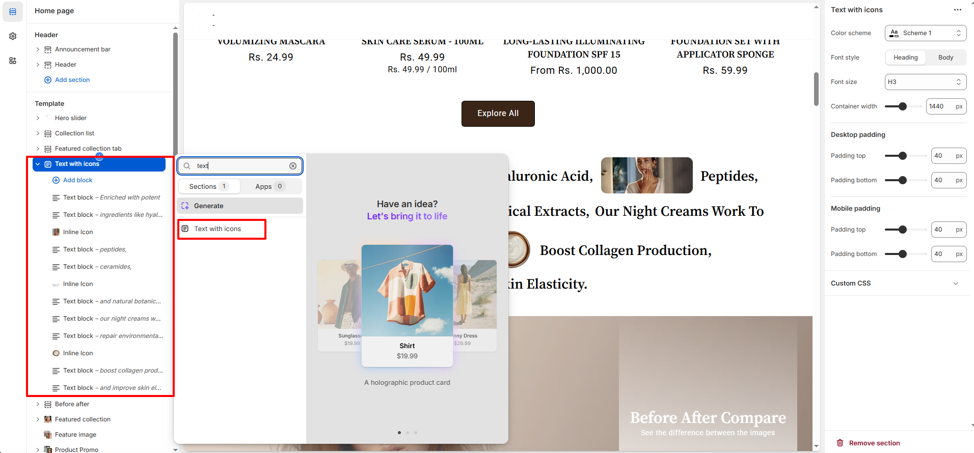 - Scroll to the Text With Icon Section or add it by clicking Add section → Text With Icon.