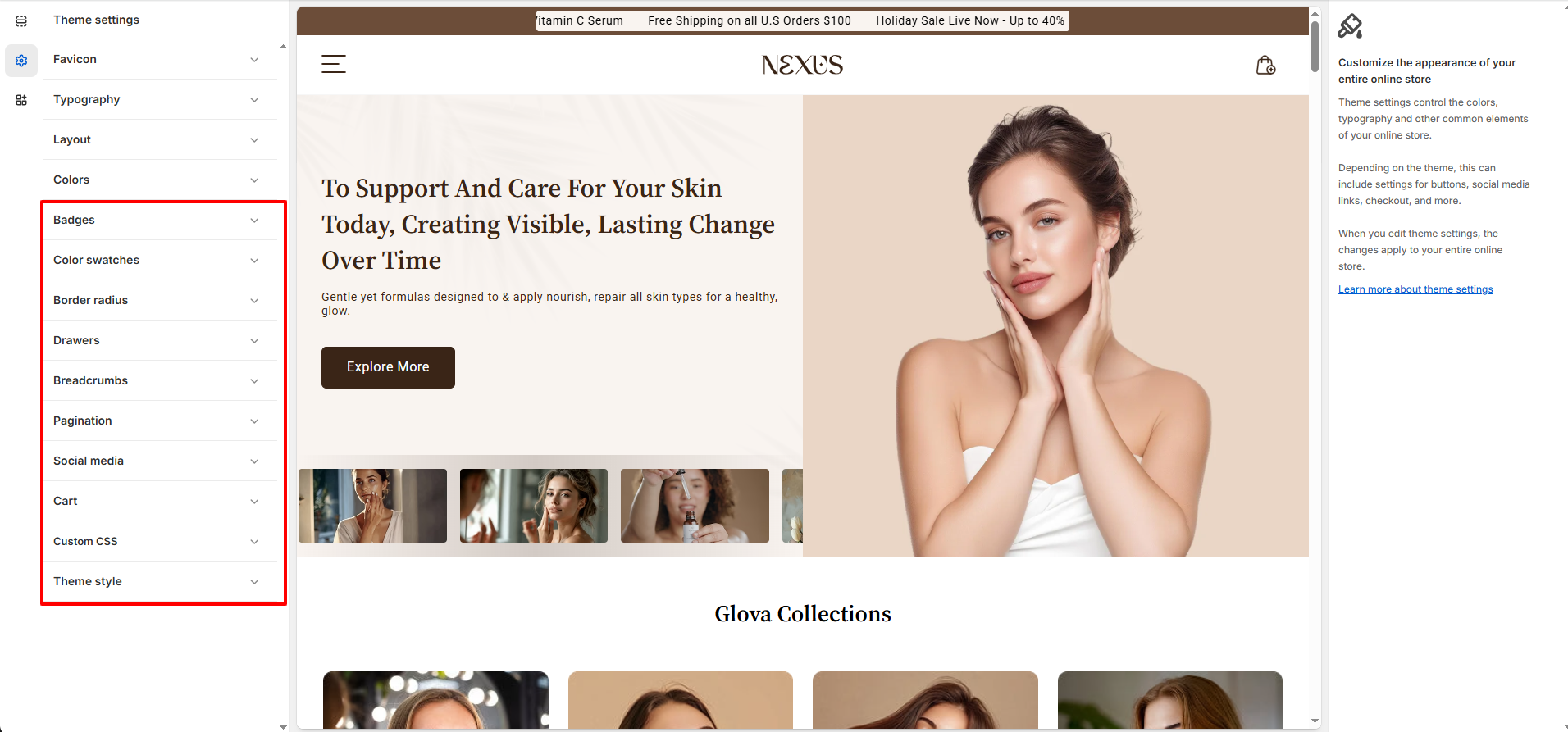 The Nexus Shopify Theme provides a versatile set of customization tools, allowing you to craft a store that perfectly reflects your beauty brand—without any coding knowledge.